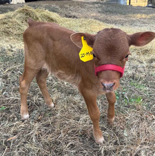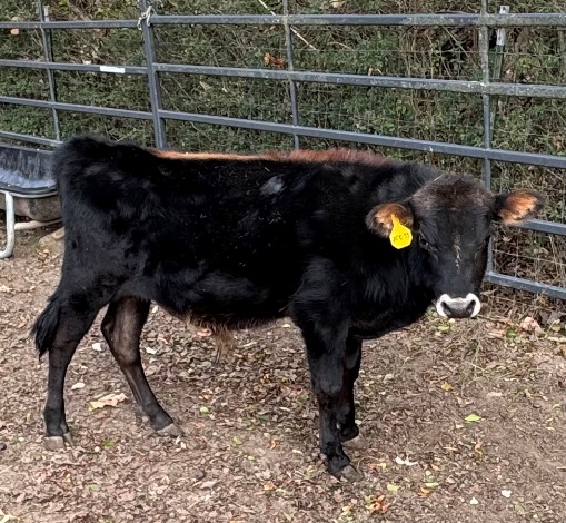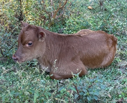 25-M-48 This charming little bull was calved on 9/5/25. He is sired by a homegrown 1/2 mini jersey bull, Moe. He is out of a home grown 1/2 mini jersey cow, Toni. His polled and a2 status will both need to be tested. His price may be adjusted after testing. $1500 or $750 as a steer