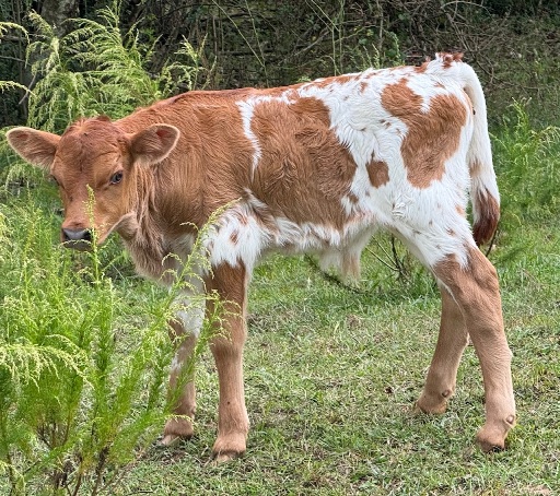 25-J-41 This little guy was calved on 8/12/25, He is out of 9412, a Corriente cow. He is sired by Joseph, our 7/8 mini jersey x 1/8 lowline bull. He is A2/A2 and polled. He has a few little spots of white. He would pair well with heifer 25-C-50 above. $1500