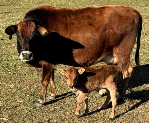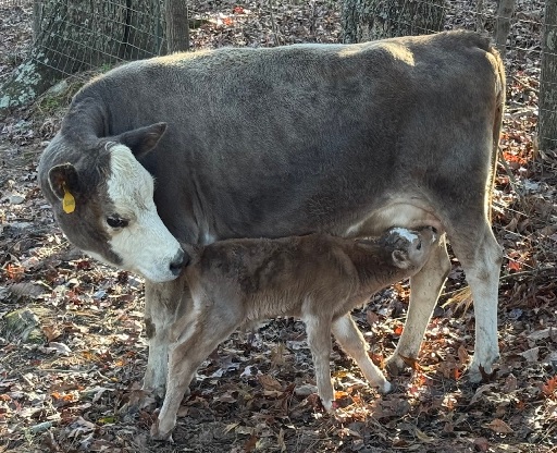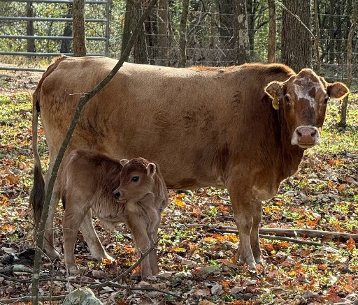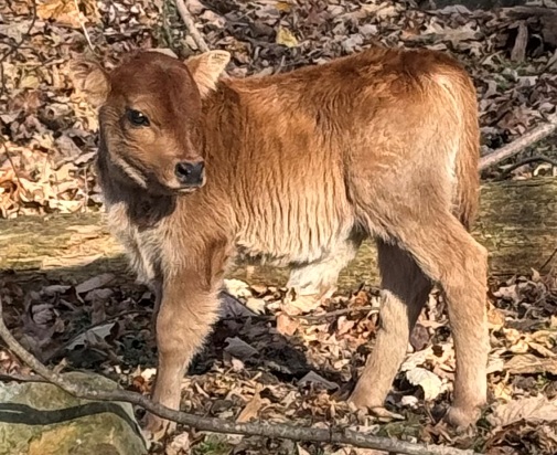 25-J-60 This awesome little guy was calved on 11/7/25. He is sired by Joseph, our 7/8 mini jersey x 1/8 lowline bull. He is out of DeeDee, a lowline x guinea pineywoods cow. So he is 7/16 mini jersey, 5/16 lowline and 1/4 guinea pineywoods. He is small and stout. He will be a great little dual purpose bull with color. He is A2/A2 and polled. 2500 obo |