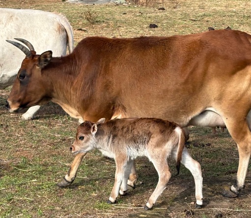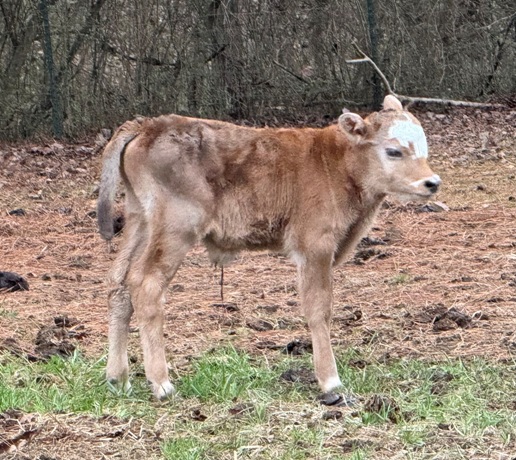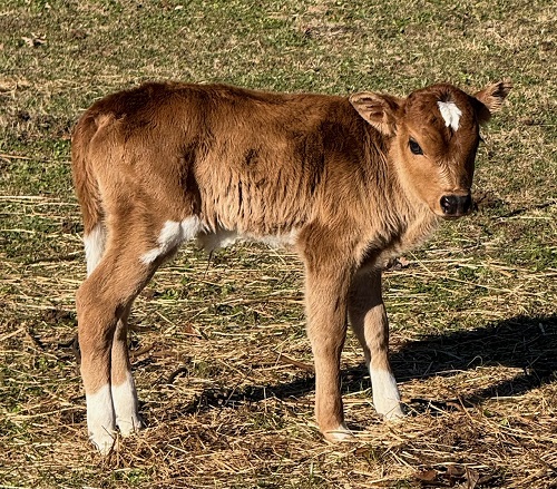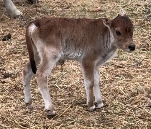 25-J-68 This handsome little bull was calved on 12/4/25. He is sired by Joseph, our 7/8 mini jersey x 1/8 lowline bull. He is out of Lanette, a purebred zebu cow. He is a2/a2 and polled. He should make a nice little bull. $1500 or $750 as a steer |