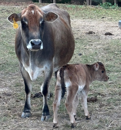 25-J-53 This pretty little heifer was calved on 10/14/25. If we hadn't already retained several heifers this year, I'd keep this one. I didn't capture it well in these pictures but she is darker across the top of her head and all the way down her back and tail. The other reason, her dam, Spec is one our original mini jersey x zebu cows and she is a great momma cow. The little heifer is sired by Jospeh, our 7/8 mini jersey x 1/8 lowline bull. She is 11/16 mini jersey x 1/16 lowline x 1/4 zebu. She should make a great little milk cow. We will have to test her a2 status. She is polled. She should be bottle trained and ready for her new home by 11/15/25. $3000 |