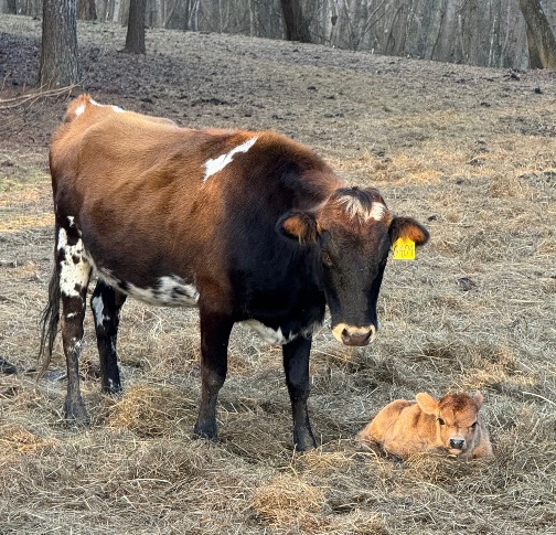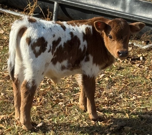 25-C-65 This striking little bull was calved on 11/24/25. He is sired by Cash, our purebred mini jersey bull. He is out of Penny, a purebred zebu cow. He is A2/A2, polled and painted up nicely. He will make someone a nice little homestead bull. $2000 obo |