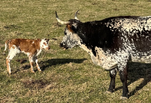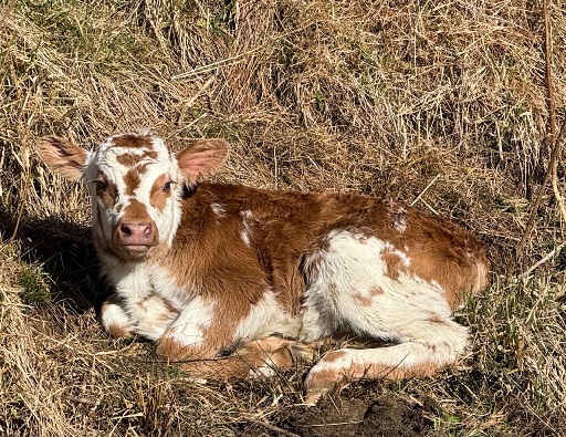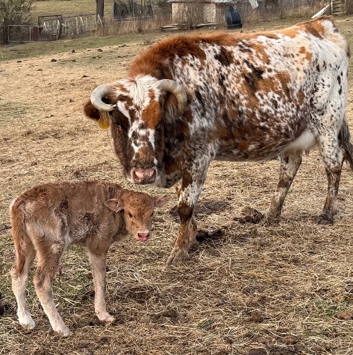 26-S-7 This splashy little bull was calved on 2/12/26. He is sired by Sonny, our South Poll x Lowline bull. He is out of Avocado a purebred Corriente cow. He should make a great little homestead type bull and will bring loads of color. He would be great paired with 26-C-4 above for a meat and milk pair. $1500 |