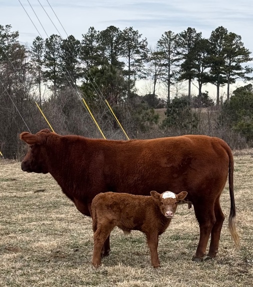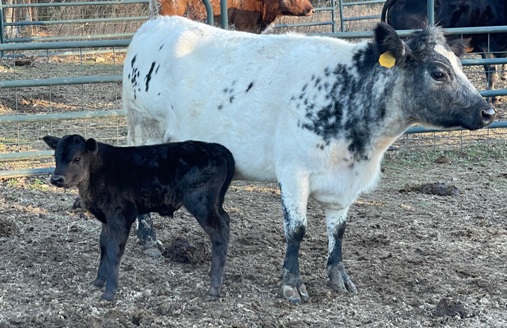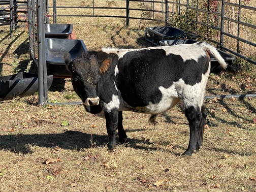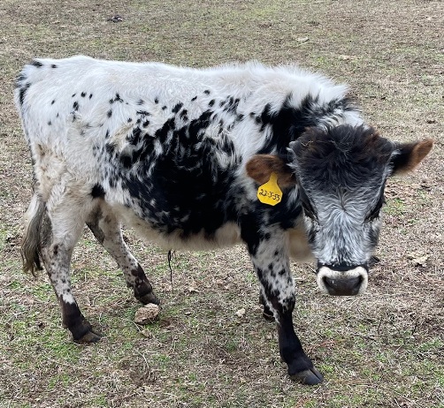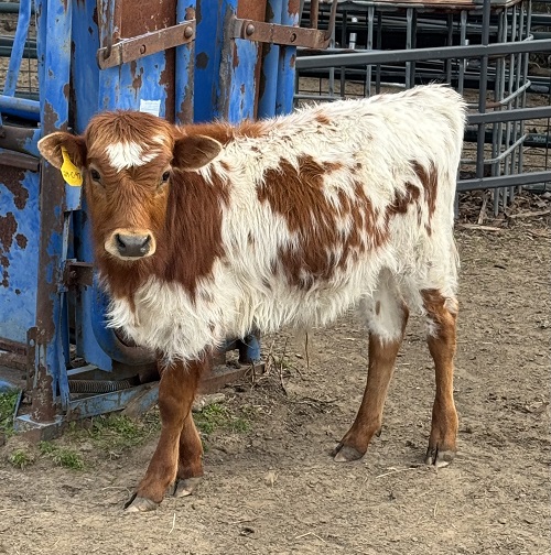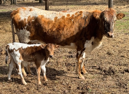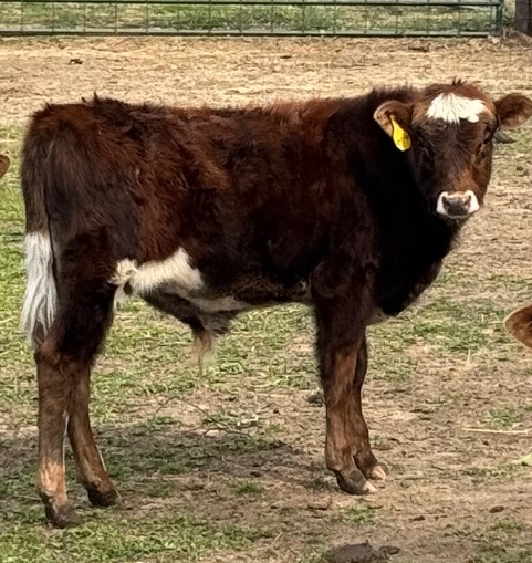 25-O-7 This loud little bull was calved on 1/19/25. His sired by a Willie son named O'malley. We will only have a few calves by O'Malley this year. This little guy should should add loads of color to any breeding program. He would be one to sit on the front porch and look at each afternoon. This loud little bull and two heifers have gone to the White Farm to start their small beef herd.