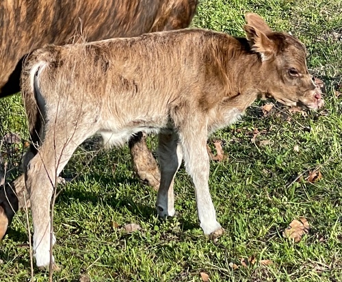 25-J-8 This adorable mini jersey cross bull calf was calved on 1/23/25. He is sired by Joseph, 7/8 mini jersey x 1/8 lowline. He is out of Lanette, a mini zebu cow. He is 7/16 mini jersey, 1/16 lowline, 1/2 zebu. By parentage he is A2/A2 and polled. He should make a nice little bull one day. Troy, I hope he makes a great Jr rodeo bull for you. |