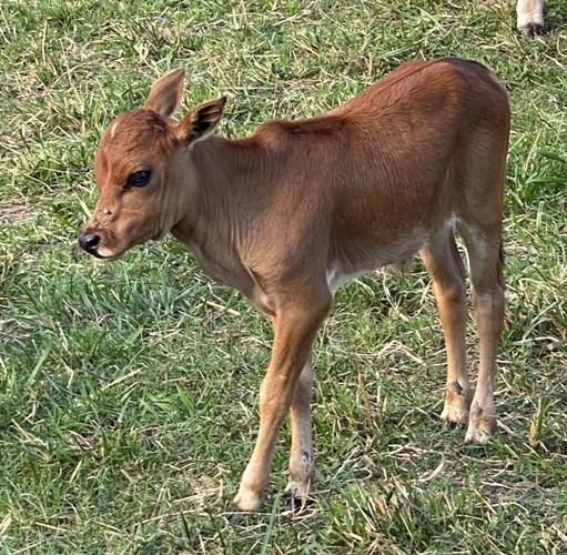 24-J-23 This tiny miny jersey cross bull was calved on 4/7/24. He is sired by Joseph, our 7/8 mini jersey x 1/8 lowline bull. He is out of Marbles one of our smallest zebu cows. He is A2/A2 and polled. He will mature under 36".