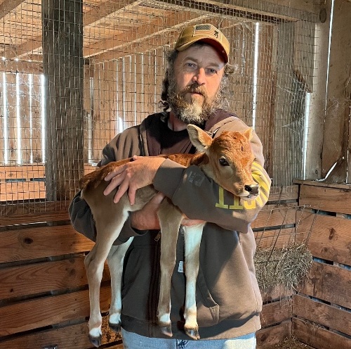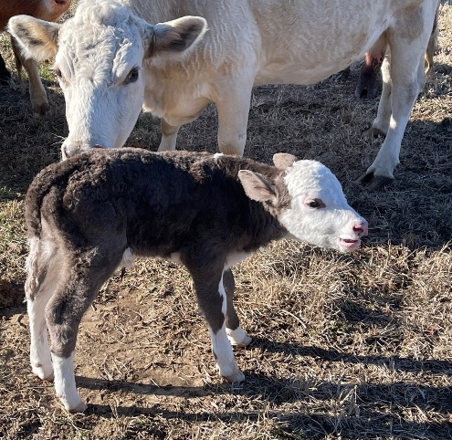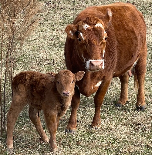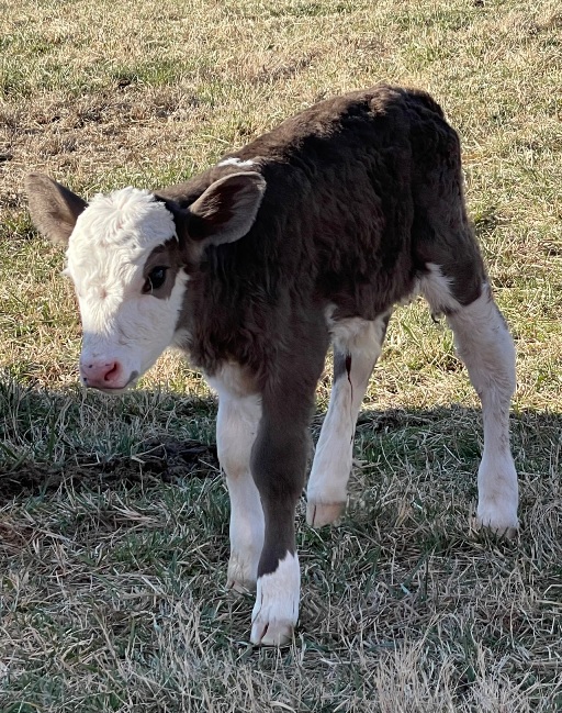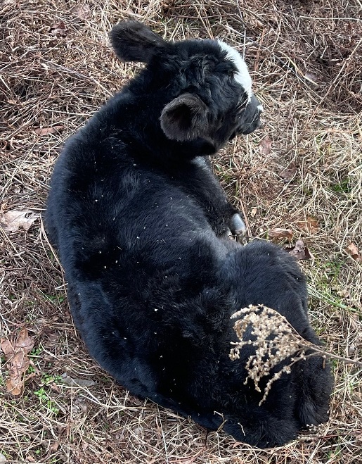 24-J-5 This little mini jersey cross bull was calved on 1/26/24. He is sired by our mini jersey bull, Joseph. He is out of a homegrown cow, DeeDee. He is A2/A2 and polled. If he is anything like the last two calves from these two, he will be short and stout. He will be a nice little bull. JD, I hope me makes some great beef for you. |
