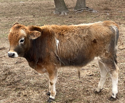 24-C-34 This little guy was calved on 7/13/24. He is sired by our purebred mini jersey bull, Cash. He is out of the zebu cow, Sage. He is A2/A2 and polled. He will make a nice little bull. He measured 35" tall on 2/23/25. Leslie, I hope he makes a great pasture mate for your steer and a good pet for you as well.