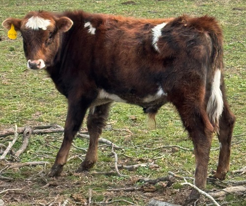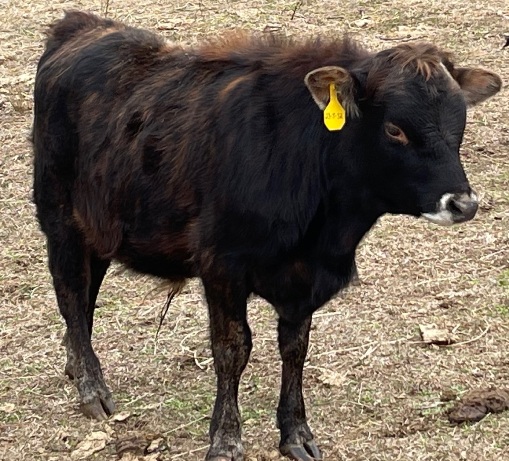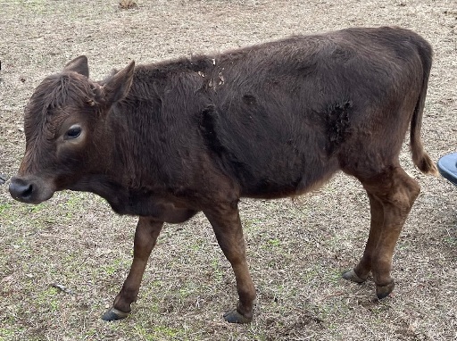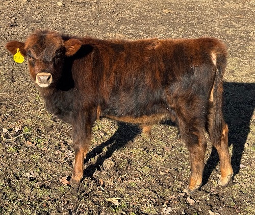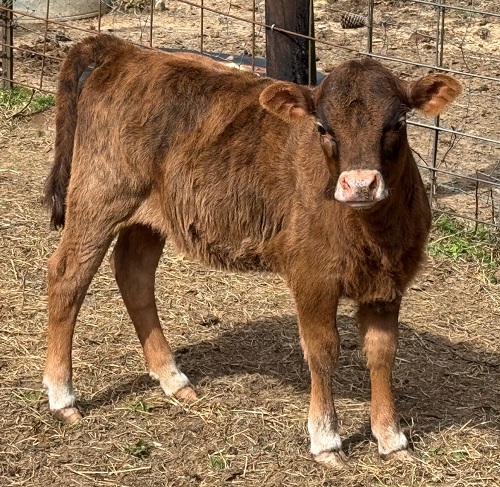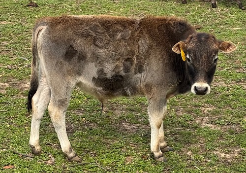 24-J-10 This handsome little mini jersey cross bull calf was calved on 2/15/24. He was sired by our mini jersey bull Joseph, 7/8 mini jersey x 1/8 lowline. He is out of a crossbred cow Andi, 1/2 lowline x 1/2 zebu. We know from parentage that he is A2/A2 and polled. He is maturing nicely and will make a nice little bull for a small homestead.