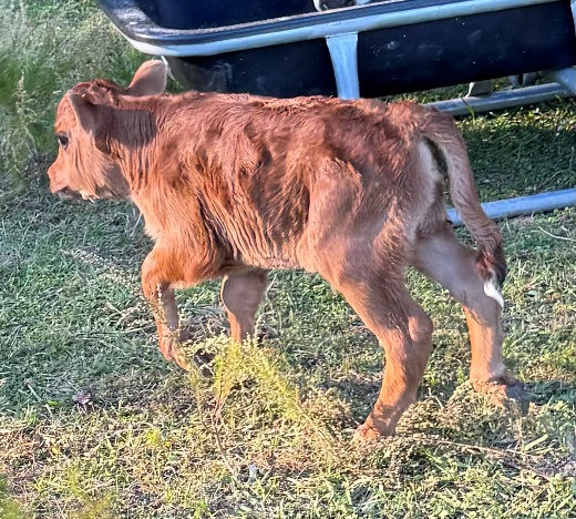 25-J-35 This cute little heifer was calved on 6/16/25. She is sired by Joseph, our 7/8 mini jersey x 1/8 lowline bull. She is out of Alexa, a lowline x zebu cow. She will need tested for a2 status. She is polled. She is a little girl. She will be bottle trained. She should be ready to go to her new home in mid to late July. Toni, I hope she makes a great pet for you and a wonderful little milk cow when she is old enough.