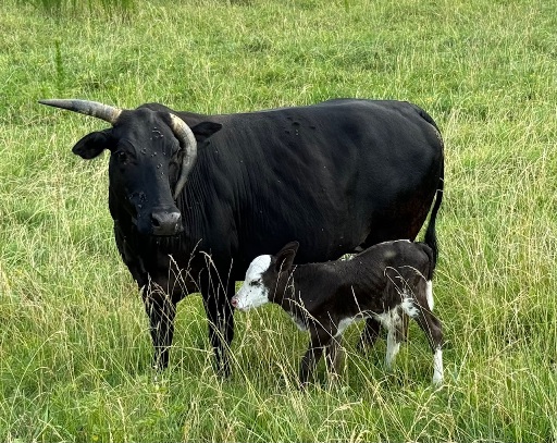 24-J-40 This chunky little guy was calved on 8/30/24. He is sired by Joseph, our 7/8 minim jersey x 1/8 lowline bull. He is out of Accalia, a lowline x Guinea Pineywoods cow. He is A2/A2 and polled. He measured 36" tall on 2/1/25. He will be a good dual purpose type bull. Troy, I hope he makes a great Jr rodeo bull for you.