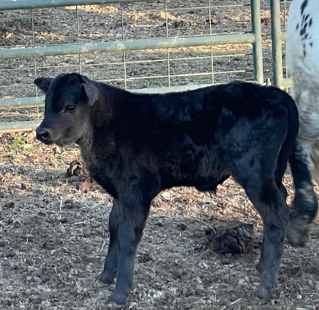24-G-1 This handsome little bull is our first calf of the new year. He is a lowline cross. He should make a nice stout bull. His dam is a great momma cow for us.