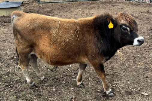 23-J-53 This little 11/16 mini jersey bull was calved on 11/13/23. He is sired by our mini jersey bull, Joseph and out of one of our homegrown cows, Nell. He is a little guy! He is a2/a2 and homozygous for polled. You can already see he is going have a lot of personality. He is ready for his own herd of cows. He measured just a little over 39 inches on 2/1/25. Alex, I hope he is great addition to your farm.