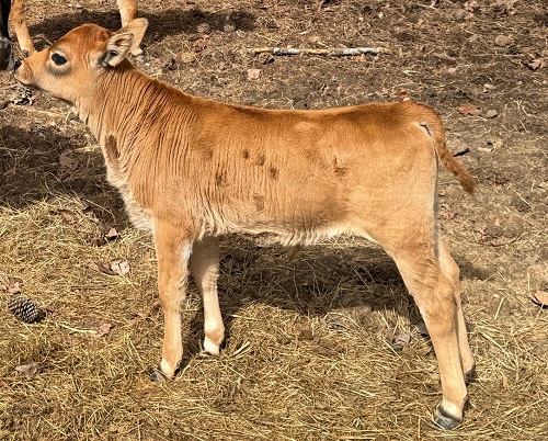 24-C-7 This handsome fawn colored 3/4 mini jersey bull was calved on 2/1/24. He is naturally polled. We will have to submit test for A2 beta casein. He is sired by our mini jersey bull Cash and out of a homegrown cow, Raspberry. He should make a very nice bull. He would pair great with 24-J-8 above. Maggie and Dillon, I hope he makes an awesome little bull for you. |