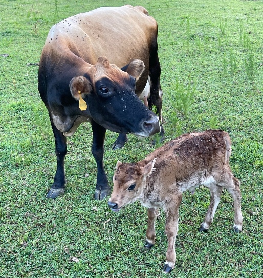 This is "Clover" the little girl that got us started down this path. She is 3/4 mini jersey, so when she is bred to a purebred bull, the resulting calf will be 7/8. She is Josey's cow. He loved her to death and milked her through several lactations. She had a pretty heifer in 2023 that we will be retaining. |