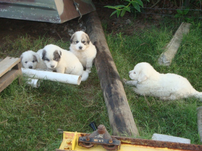 In May 2010, Sam had a litter of puppies. The one male, the solid white one, and one of the girls are staying here. The other puppies have already been sold. |