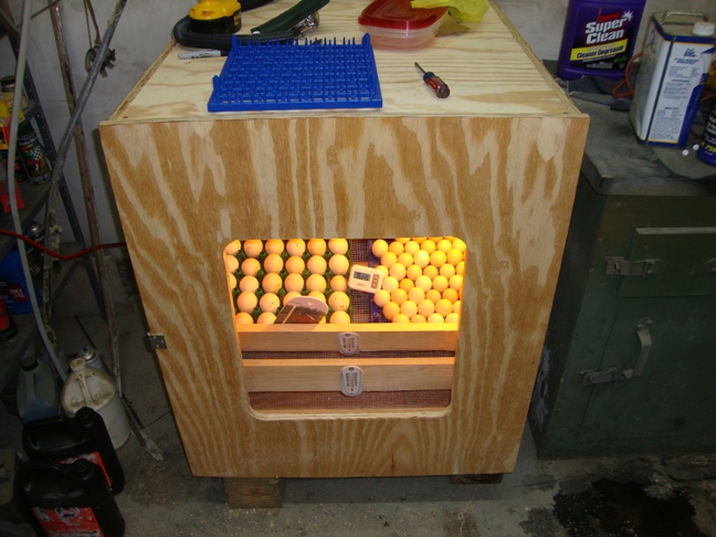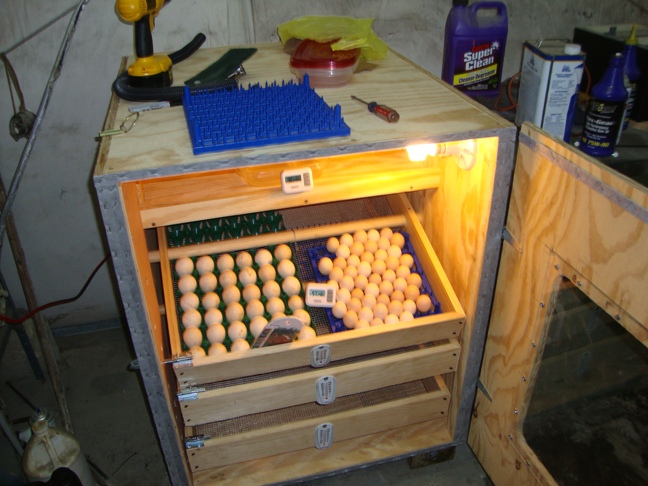 After using one of the styrofoam incubators with varied success, I decided to build my own cabinet incubator. I finished it this past week and set the first eggs on Father's Day. There are 3 tilting shelves that will hold 4 of the plastic egg racks each, and they are deep enough to double stack them if needed. I will have to manually tilt the shelves each day, I hope this works. |